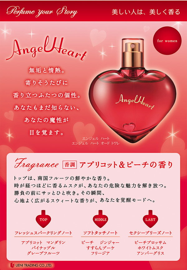 トップノート:アプリコット、マンダリン、パイナップル、グレープフルーツミドルノート:ピーチ、ジンジャー、すずらんブーケ、フリージアラストノート:ピーチブロッサム、ホワイトムスク、アンバーグリスメーカーまたは輸入元エンジェルハート広告文責株式会社香水カンパニー TEL : 0761-46-5250区 分日本製・化粧品(フレグランス)原産国日本商品について・流通時期によって、商品の成分、色味、パッケージが若干異なる場合がございます。