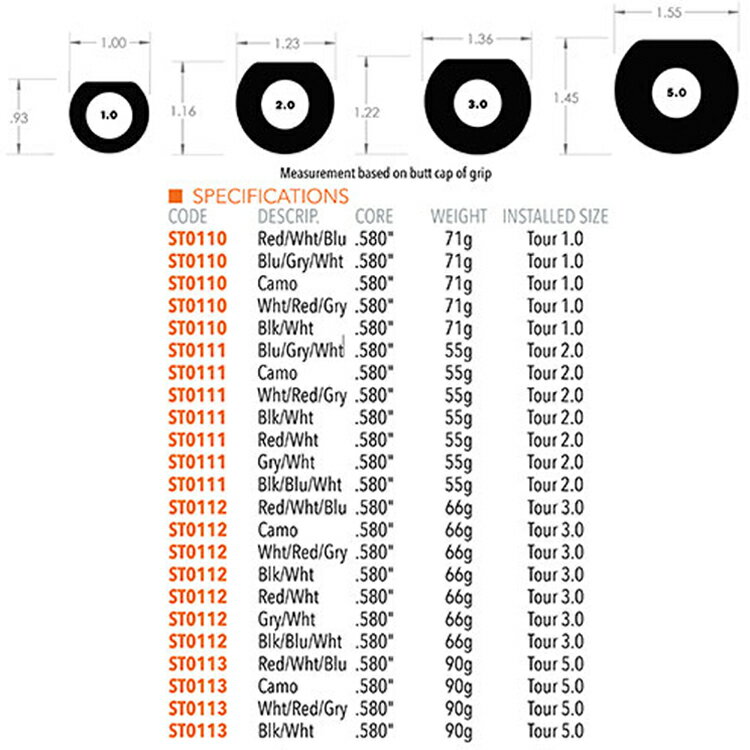 グリップ口径:0.580" 全長:約270mm 重量:約57±5g 形状:ノンテーパーパターグリップ 断面形状:半円柱 ※カウンターコアウエイト別売